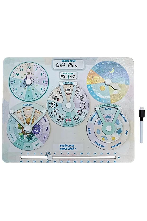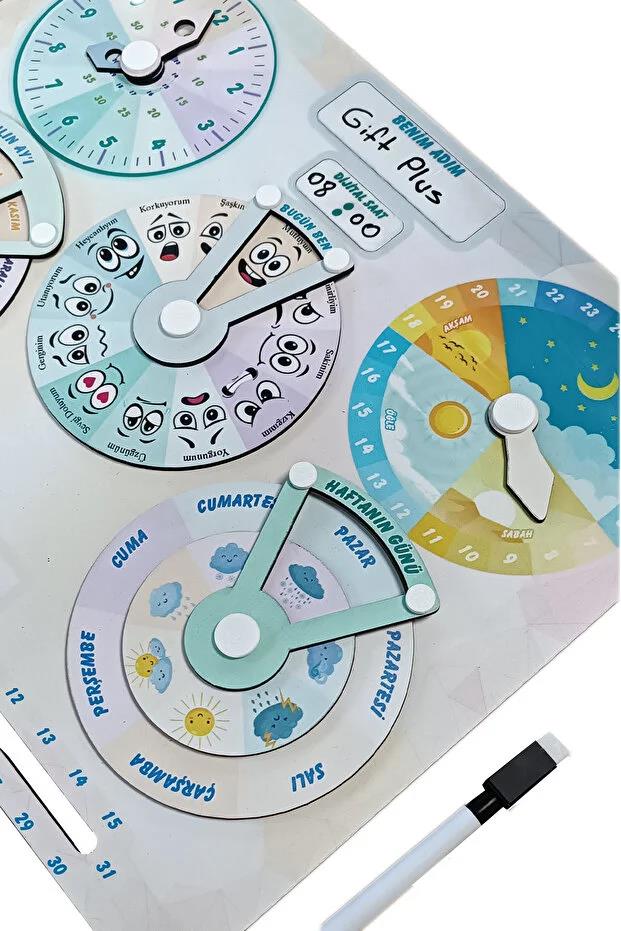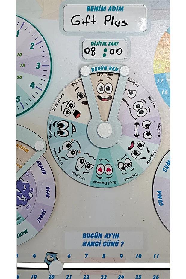 Çocuklara saat, gün, ay, mevsim ve duygu kavramlarını eğlenceli şekilde öğretmek için tasarlanmış eğitim panosu.