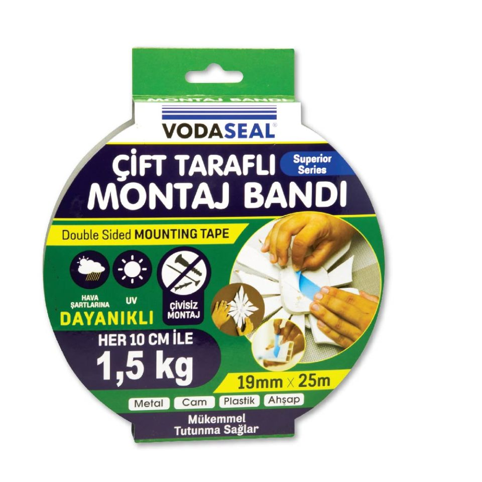 Çift taraflı montaj bandı; PE köpük esaslı, çok güçlü akrilik yapışkana sahip, iç ve dış mekanda kullanıma uygun, su ve hava şartlarına dayanıklı, metal, cam, plastik, ahşap vb. esaslı birçok malzemenin sabitlenmesinde kullanılan dayanıklılığı yüksek bir montaj ve sabitleme bandıdır. Neme karşı yüksek dayanıklılığı sayesinde ev içerisinde banyo, mutfak gibi nemli alanlarda güvenle kullanılır. Ayrıca hava şartlarına dayanıklılığı ile dış mekanda posta kutusu, işaret levhaları gibi objelerin montajı içinde idealdir.