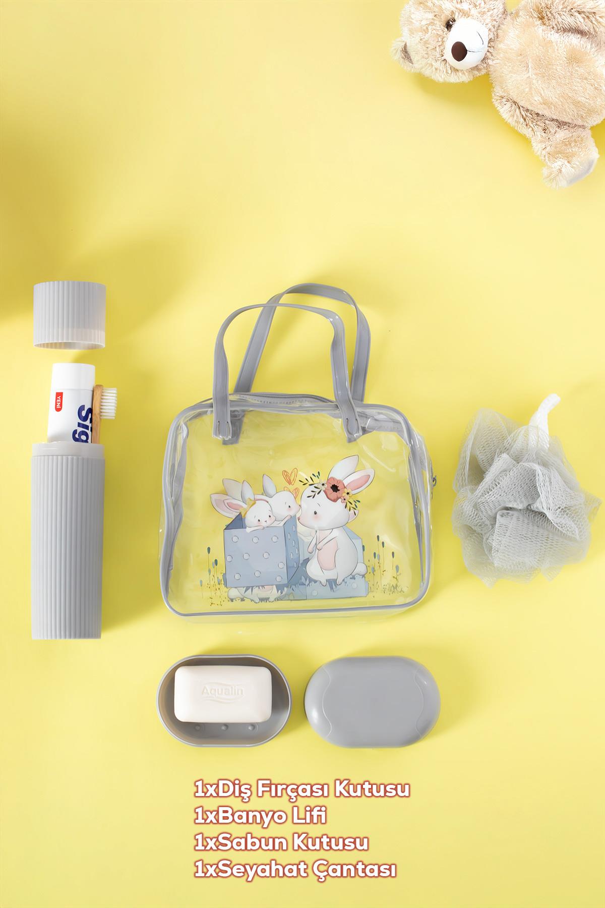 Porsima 3145 Tavşan Figürlü Seyahat Seti - Diş Fırçası Kutusu Banyo Lifi Sabun Kutusu Seyahat Çantası Gri